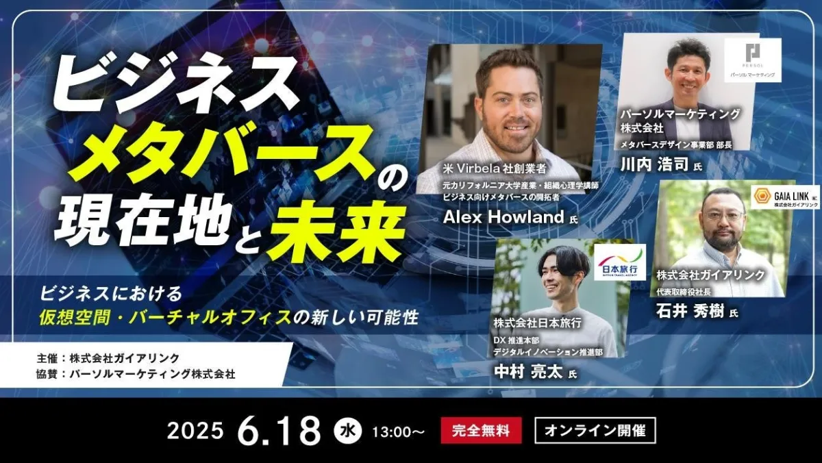 2025年6月18日、株式会社ガイアリンクが主催するオンラインセミナー「ビジネスメタバースの現在地と未来」が開催され、メタバースに関する新しいビジネス活用方法が紹介されます。メインスピーカーには、バーチャルオフィスプラットフォーム「Virbela」の創業者であり、BtoB活用の第一人者であるアレックス・ハウランド氏が登壇。
