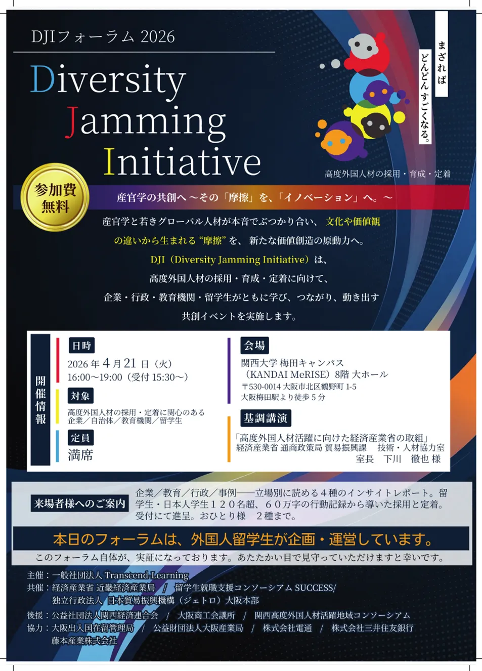 本日16時、関西大学梅田キャンパスにて、「DJIフォーラム2026 ─ Diversity Jamming Initiative ─」が開催されます。このフォーラムは、一般社団法人Transcend-Learningが主催し、外国人留学生を中心に9か国の学生120名が参加する産官学共創プログラムの一環として行われるものです。フォーラムでは、経済産業省による基調講演や、約60万字に及ぶ行動記録を分析した『DJI INSIGHT REPORT』が発表され、来場者には無料で配布されます。