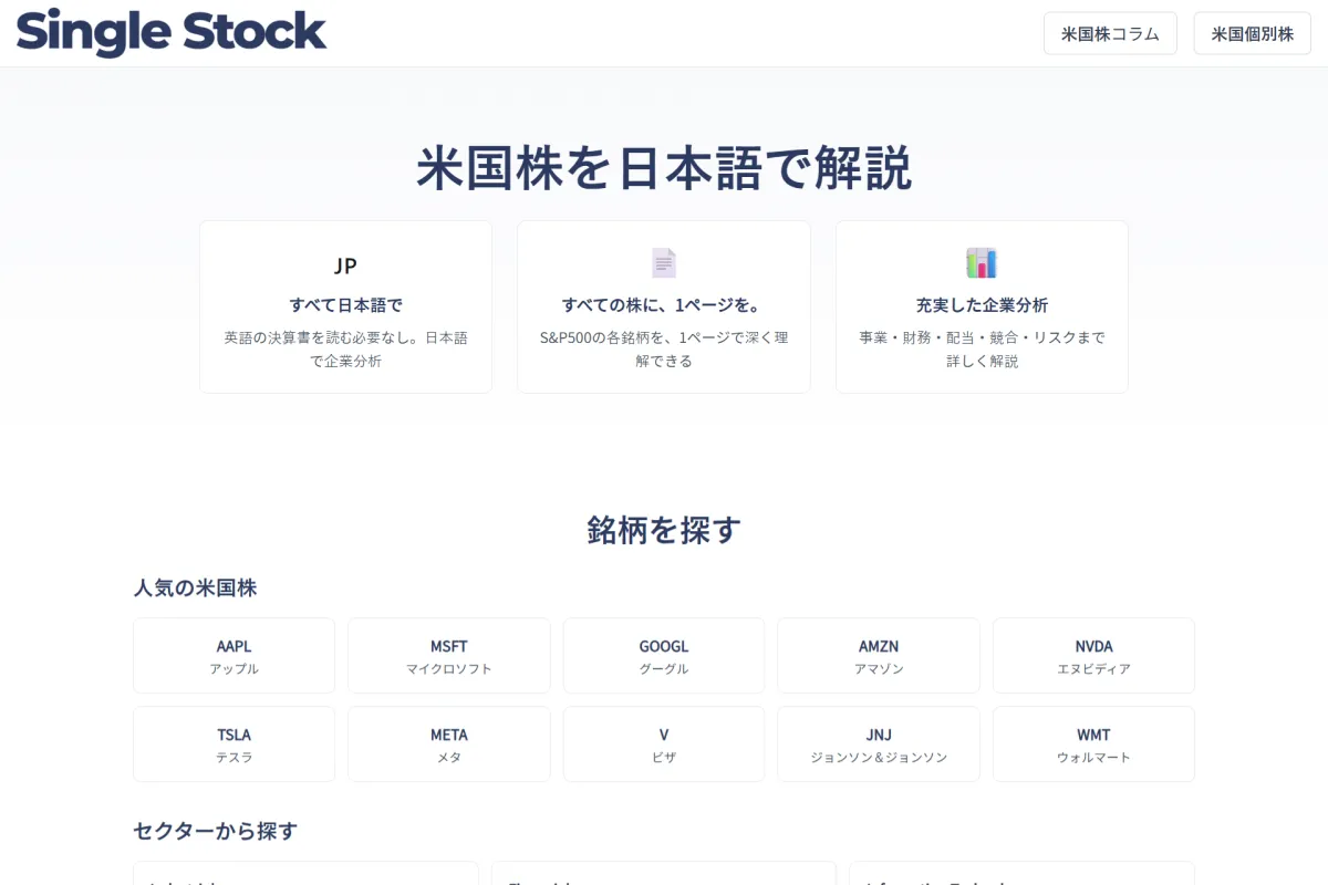『Single Stock』では、ただ銘柄を紹介するだけでなく、米国株の基礎知識や、投資に際しての判断軸、実務的な注意事項などをロングライティングで掘り下げたコラムも用意しています。これにより、投資家は必要な文脈を十分に理解しながら銘柄を選ぶことができます。特に、「NISAの活用」や「税務」についての説明は、投資判断を行う上で非常に重要です。
