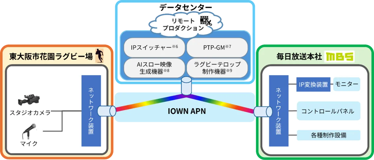 2025年に開催される「第105回全国高等学校ラグビーフットボール大会」では、NTT西日本グループが株式会社毎日放送に対して、IOWNオールフォトニクス・ネットワーク(IOWN APN)を利用したリモートプロダクションの実証を行いました。この取り組みは、高度な映像制作技術をデータセンターに集約することで、制作の効率化と映像の品質向上を目指すものです。