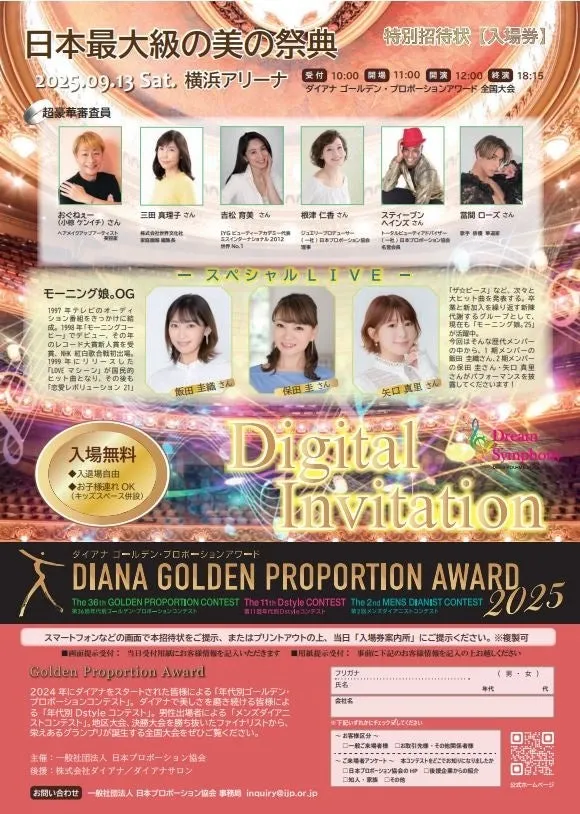 2025年9月13日土曜日、横浜アリーナにて国内最大規模の美の祭典、「ダイアナ ゴールデン・プロポーションアワード2025」が開催されます。このイベントは、プロポーションづくりを専門とする株式会社ダイアナ(東京都渋谷区)の主催により行われ、一般社団法人日本プロポーション協会が後援しています。入場は無料で、誰でも参加が可能です。