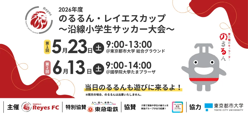 また今回は、東急SレイエスFCアカデミーチームの選手との交流や、東急線のキャラクター「のるるん」にも会える機会が設けられています。地域の子どもたちが一堂に集まり、サッカーの楽しさを共有できるこの機会をぜひお見逃しなく。