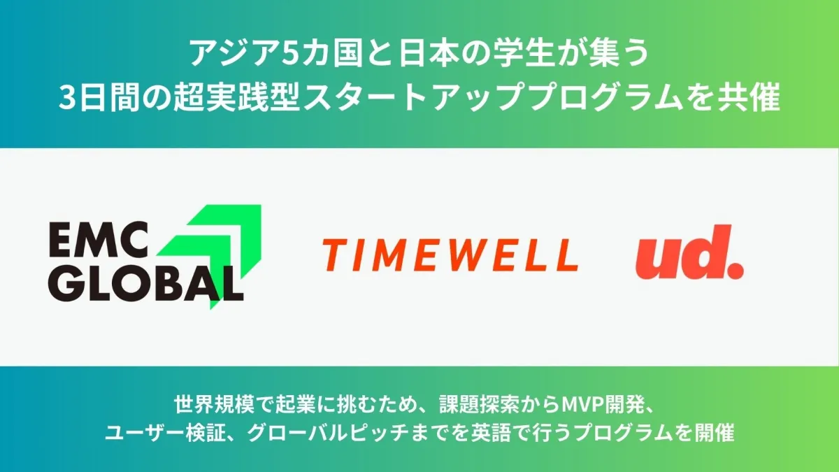 2026年2月に、株式会社TIMEWELLが一般社団法人EMC GLOBALおよびUnderdogs社と協力し、アジア5カ国と日本の学生が集うスタートアップBootCampを開催します。このプログラムでは、インド、フィリピン、インドネシア、シンガポール、タイから参加する学生9名と、日本在住の選抜された12名の学生が一緒に事業を磨く貴重な経験を提供します。