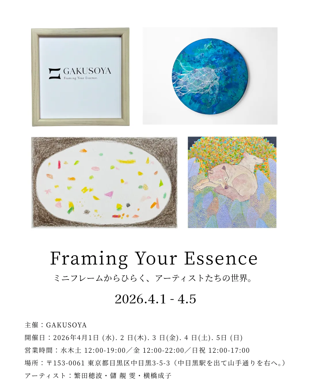 額縁の端材を使用し、一点もののミニフレームを制作するブランドGAKUSOYA(ガクソウヤ)が、2026年4月1日(水)から5日(日)までの5日間、東京・中目黒の「Space Utility TOKYO(SUT)」で初のグループ企画展を開催します。この企画展のテーマは「Framing Your Essence」。様々なアーティストの作品をミニフレームに額装した“完成形”を展示・販売し、アート体験を提供します。