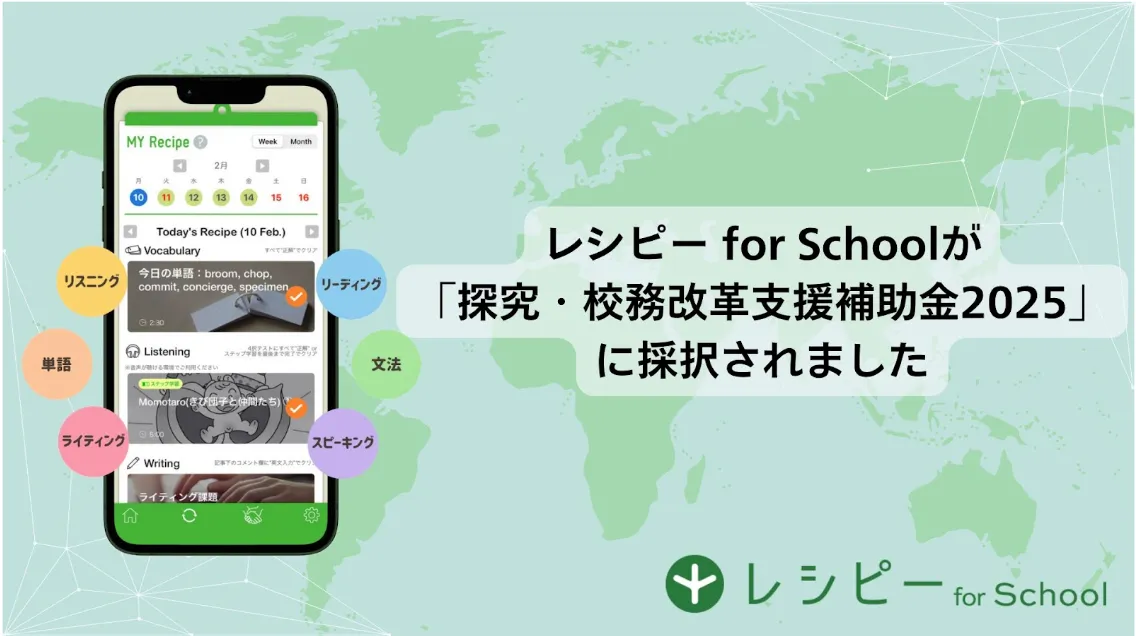 株式会社ポリグロッツが提供するAI英語学習サービス「レシピー for School」が、経済産業省の「探究・校務改革支援補助金2025」に採択されました。このプログラムにより、全国の中学校や高等学校、自治体に向けて、無償での試験導入が可能となります。学校の業務効率化を進めるために、ぜひご利用ください。