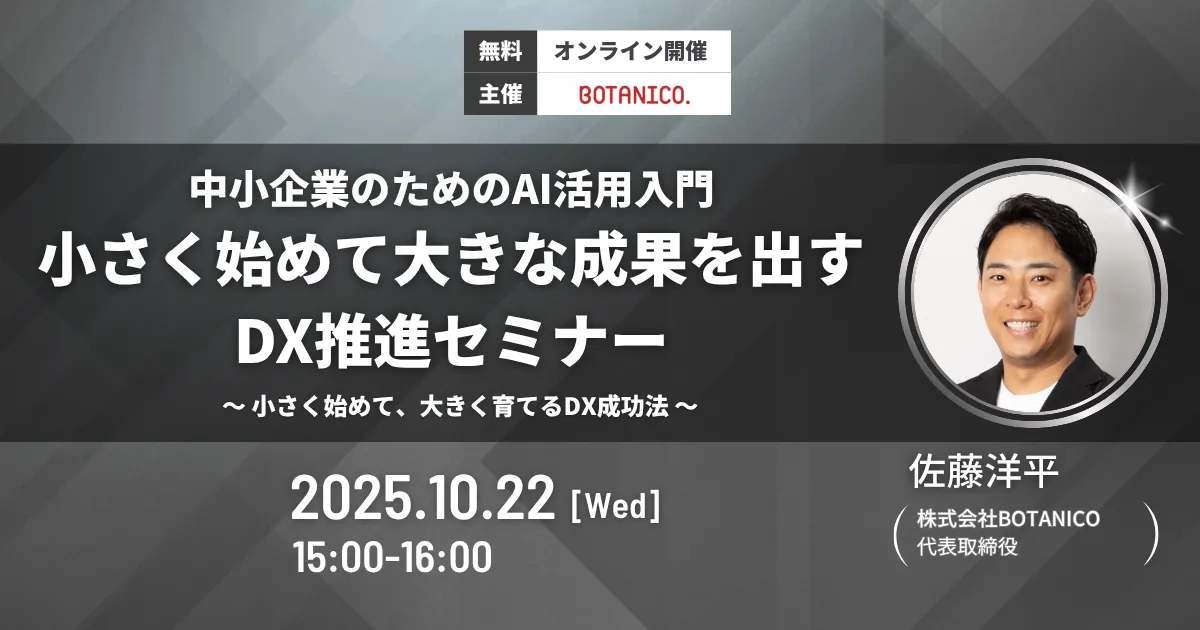 本日15:00より「中小企業のためのAI活用入門セミナー」が開催されます。人材不足やコスト上昇、競争の激化といった中小企業が直面する課題に対し、AIを活用したデジタルトランスフォーメーション(DX)が重要となっています。具体的な方法を学ぶことで、効果的にビジネスの成長を促進し、役立つ手段を見出す良い機会です。