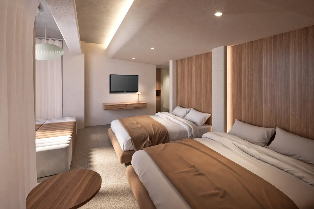 「HOTEL ON\OFF」は、宿泊を通じて訪れる人々に心の休息と活力を与えることを目指しています。全室34㎡という広さを持つ客室は、家族や友人との旅の疲れを癒し、ひとりで仕事をするための環境としても理想的です。おわりと始まり、休息と活動が行き交うこのホテルでは、ゲスト同士が快適に過ごせるよう、居心地の良い空間を提供します。