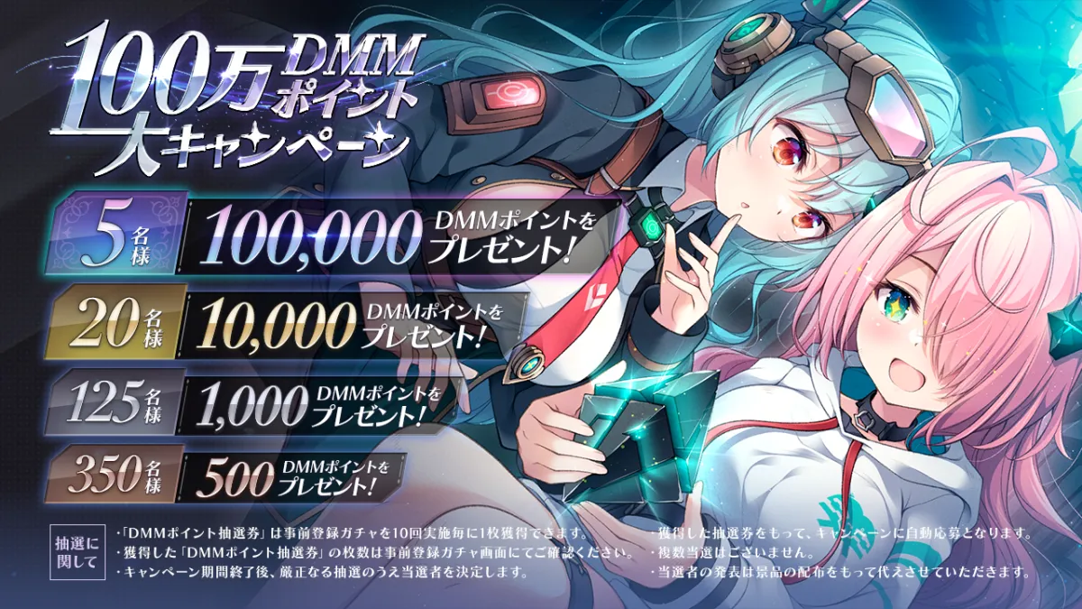 事前登録特典として、★5キャラクターの確率が上昇するガチャも実施中です。このガチャを通じて、リリース前にキャラクターストーリーを楽しむことも可能です。また、100万DMMポイントをかけたキャンペーンも同時開催中で、抽選に参加することで最大10万DMMポイントが当たるチャンスがあります。