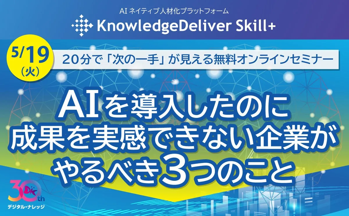 このような課題を克服するため、株式会社デジタル・ナレッジは、AI活用人材の「可視化」「育成」「評価」を行う新たなスキル管理サービス「KnowledgeDeliverSkill+」を刷新しました。この新しいモデルは、AI活用の「二極化」を打破し、全社員がAIを業務に活かせる土台を作ることを目的としています。