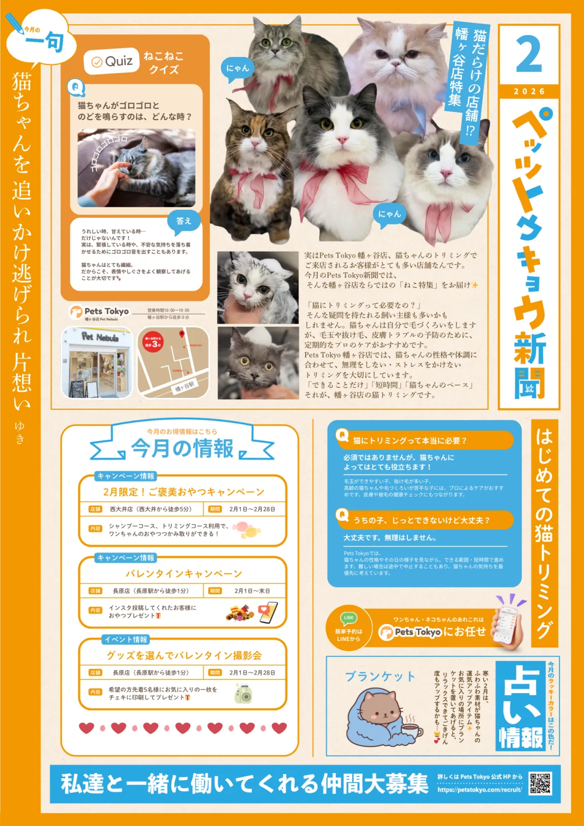 Pets Tokyo株式会社が発行するフリーペーパー「ペッツトウキョウ新聞」の2月号が届きました。この号では、ますます人気が高まる“猫との暮らし”をテーマに特集を組んでいます。猫を飼っている方やこれから飼おうと考えている方には必見の内容です。