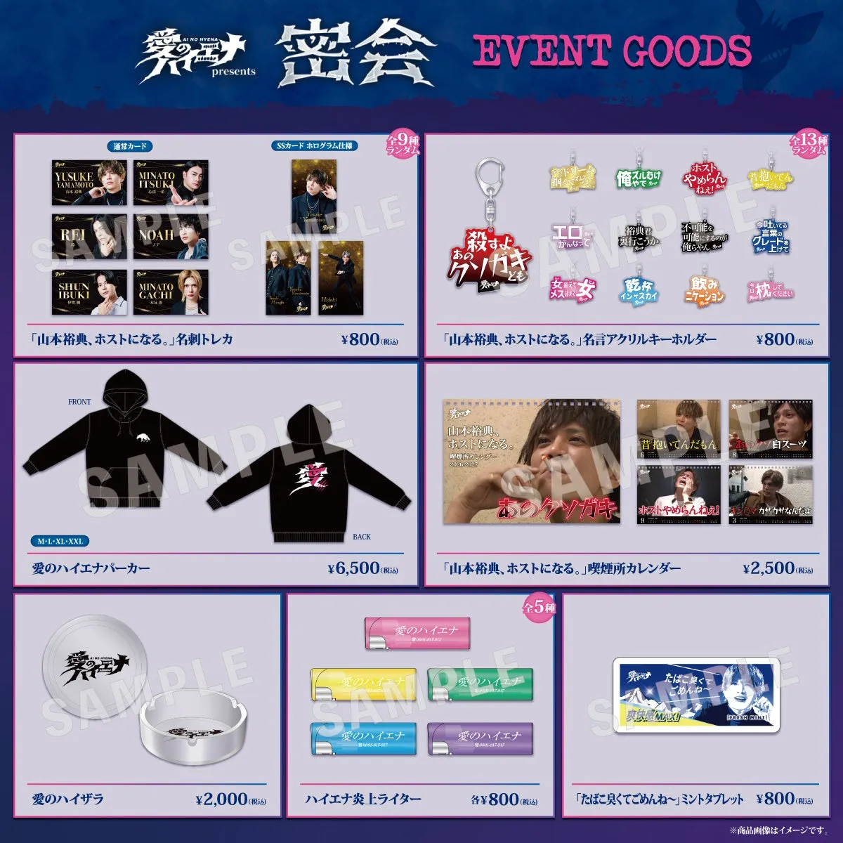 今回のイベントでは、会場限定のオリジナルグッズの販売も行います。パーカーや灰皿、ライターなど、番組のイメージが詰まった商品が登場します。とりわけ、「山本裕典、ホストになる。」からは、顔写真が入った名刺トレカ(全9種類)や名言を集めたアクリルキーホルダー(全13種類)が手に入るチャンスがあります。また、山本裕典の名言を集めた喫煙所カレンダーや、ミントタブレットも販売予定です。