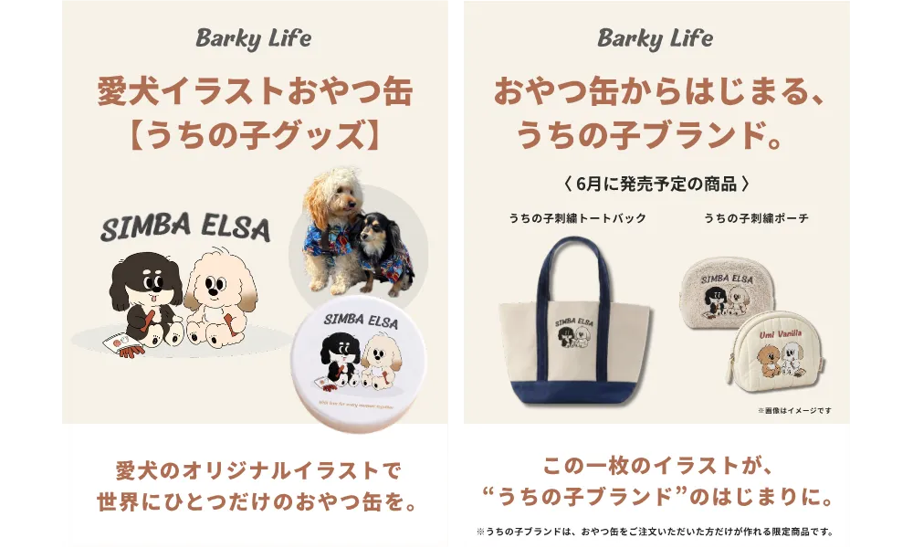 さらに、6月にはおやつ缶を購入した方のわんちゃんのイラストデータを使ったグッズの発売も予定しています。具体的には、「うちの子刺繍ポーチ」や「うちの子刺繍トートバッグ」が登場予定で、愛犬をテーマにした商品のラインアップが広がります。詳細な価格については現在検討中です。