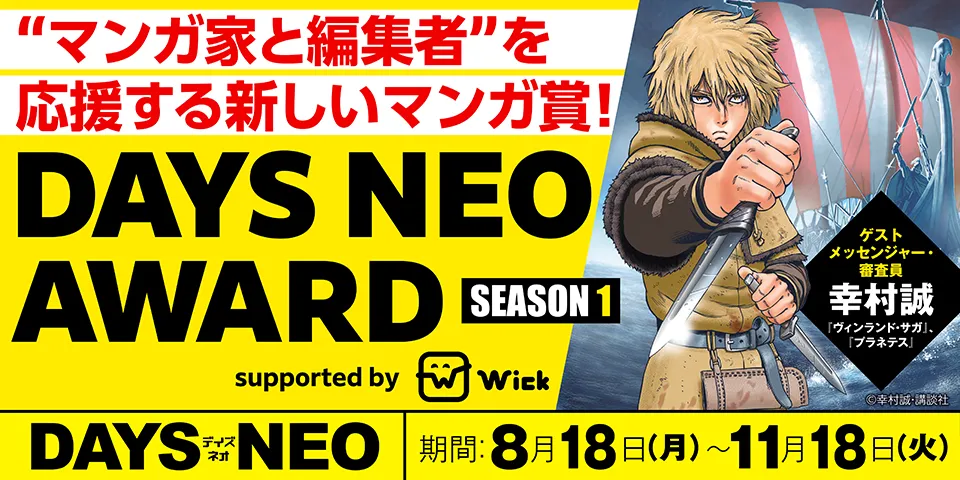 講談社 クリエイターズラボが運営する「DAYS NEO」と、マンガアプリ「Wick」が手を組み、“マンガ家と編集者”を支援するマンガ賞「DAYS NEO AWARD supported by Wick」を発表しました。この賞は、約1年間にわたり全4回開催され、マンガ家たちの夢を実現する大きな舞台となることを目指しています。