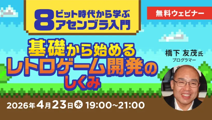 このセミナーのタイトルは「8ビット時代から学ぶアセンブラ入門 基礎から始めるレトロゲーム開発のしくみ」です。開催日は、2023年4月23日(木)19:00から21:00までの2時間。オンラインで受講できるため、自宅にいながら参加可能です。