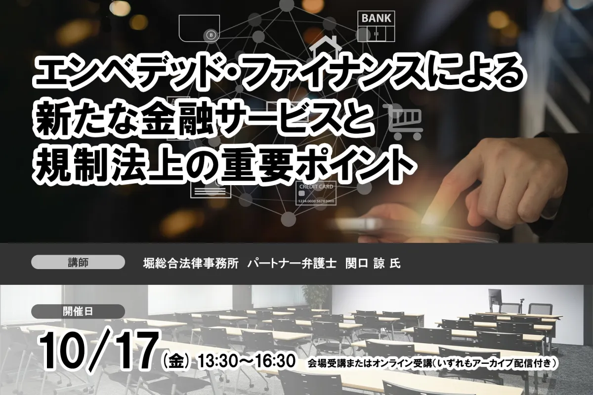 2025年10月17日、株式会社セミナーインフォが主催する「エンベデッド・ファイナンスによる新たな金融サービスと規制法上の重要ポイント」というセミナーが開催される。このセミナーは、エンベデッド・ファイナンスの現状を深く理解し、関連する規制についての最新情報を得るための貴重な機会となる。講師には、堀総合法律事務所の関口 諒氏を迎え、金融業界の今後の動向について詳しく解説される。