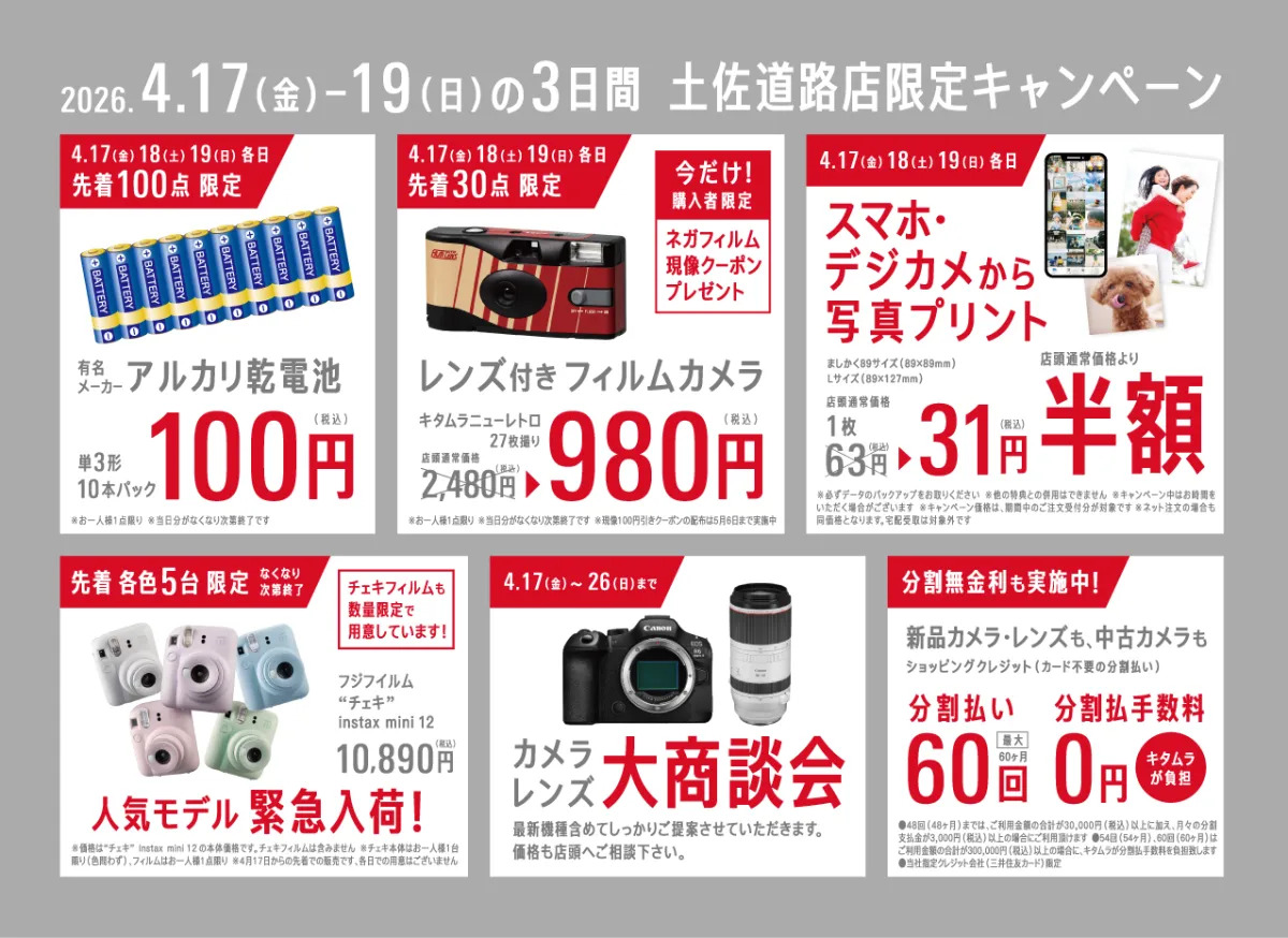 新店舗のオープンを記念して、特別なキャンペーンも用意されています。例えば、レンズ付きフィルムカメラを先着30名に980円(税込)で提供したり、写真プリント料金が半額になったりします。これらのプロモーションは2026年4月17日から19日の期間限定で実施されます。
