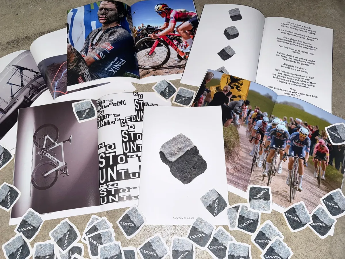 キャニオンが自信を持って発表する新型エンデュレースCFRの開発過程やブランドの哲学を詰め込んだ『ZINE』です。この小冊子では、石畳の象徴するクラシックレースに向けたバイク開発の背景や、パリ〜ルーベのような過酷なレースに挑むための戦略についてのストーリーが綴られています。参加者は、最先端技術を搭載したそのバイクがどのようにして誕生したのかを知ることができ、石畳の厳しさを乗り越えるためのこだわりを感じることができるでしょう。