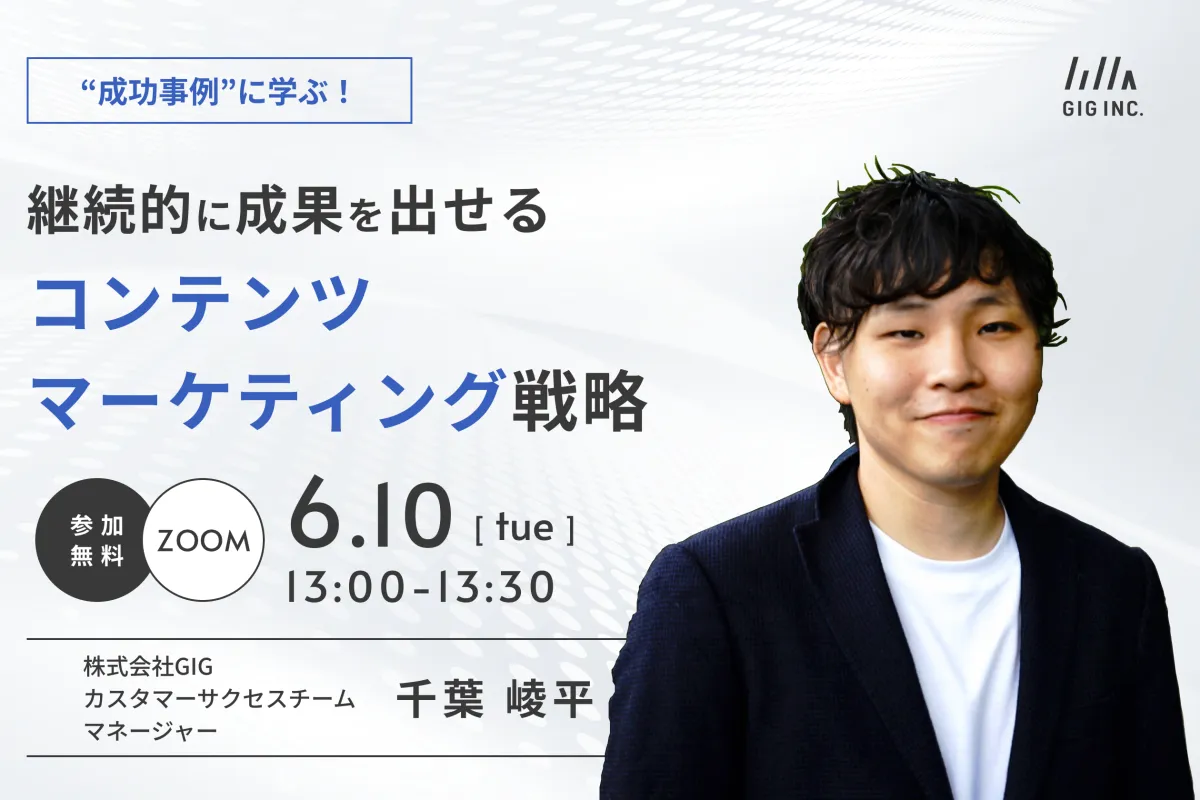 本ウェビナーの講師は、千葉崚平氏(株式会社GIGカスタマーサクセスチームマネージャー)です。大学卒業後、広告代理店に入社し、約2年半の間マーケティング職を担当。その後、フリーランスへ転身し、SaaS企業にてマーケティング施策の実行に従事。現在はGIGにて、カスタマーサクセスチームのマネージャーを務めながら、年間5,000以上のリードを獲得する実績を上げています。