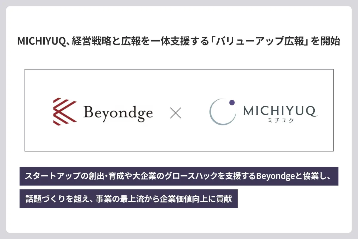 株式会社MICHIYUQは、東京都新宿区に本社を置き、スタートアップの育成や大手企業の成長戦略を支援しています。最近、同社はBeyondge株式会社と協力し、経営戦略と広報をシームレスに統合した新たなサービス「バリューアップ広報」を開始することを発表しました。本サービスは、大企業の新規事業立ち上げやスタートアップの成長を最大化することを目的としています。