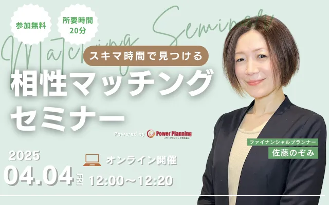 2023年4月4日(金)12時から、無料のマネーセミナー「相性マッチングセミナー」がオンラインで開催されます。運営元であるパワープランニング株式会社が提供するこのセミナーは、20代から40代の大多数が抱えるお金に関する悩みを解消するための情報を提供します。