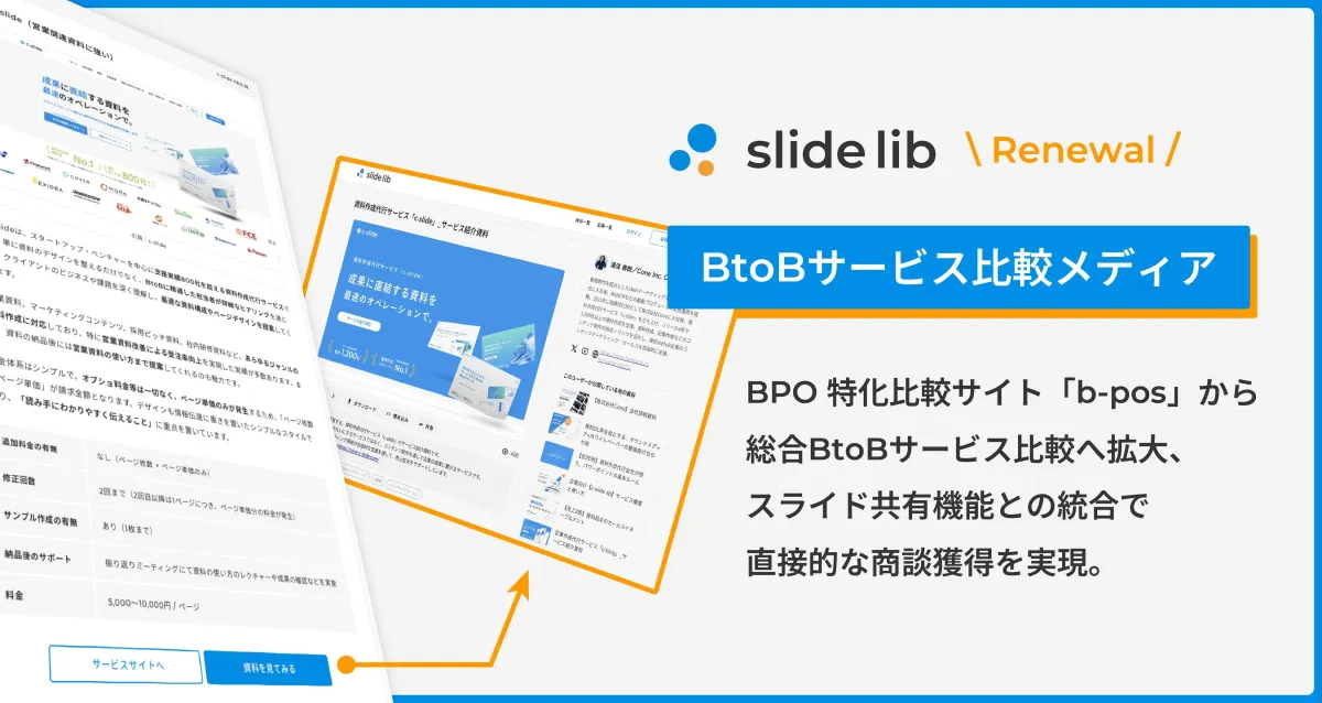 2023年6月、株式会社ConeはBPOサービスの比較サイト「b-pos」を全面的にリニューアルし、BtoBサービス資料ポータル「slide lib」として再出発しました。この変更は、企業のニーズに応じたさらなる支援を目的としています。