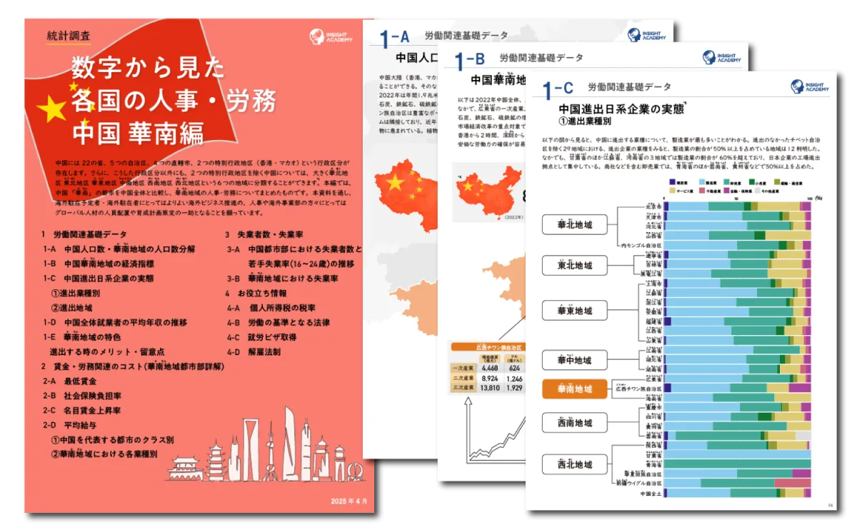 インサイトアカデミー株式会社が公開した「数字から見た各国の人事・労務中国華南編」は、グローバル人材育成を担う企業にとって、非常に価値の高い情報を集約した資料です。このレポートは、広東省、広西チワン族自治区、海南省から成る華南地域の労働市場について、詳しく分析しています。