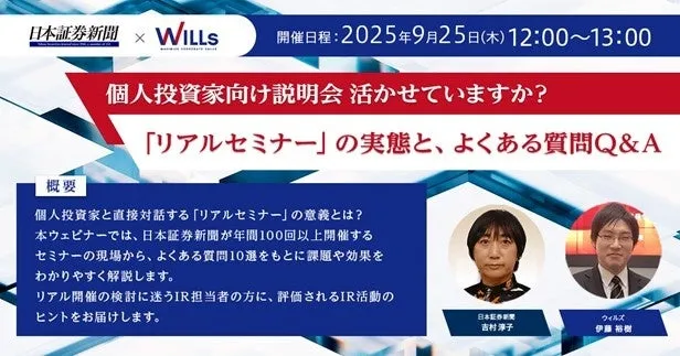 投資家と上場企業を繋ぐ役割を担う株式会社ウィルズと日本證券新聞社は、2025年9月25日(木)に「個人投資家向け説明会 活かせていますか?──「リアルセミナー」の実態と、よくある質問Q&A」と題したオンラインセミナーを実施します。