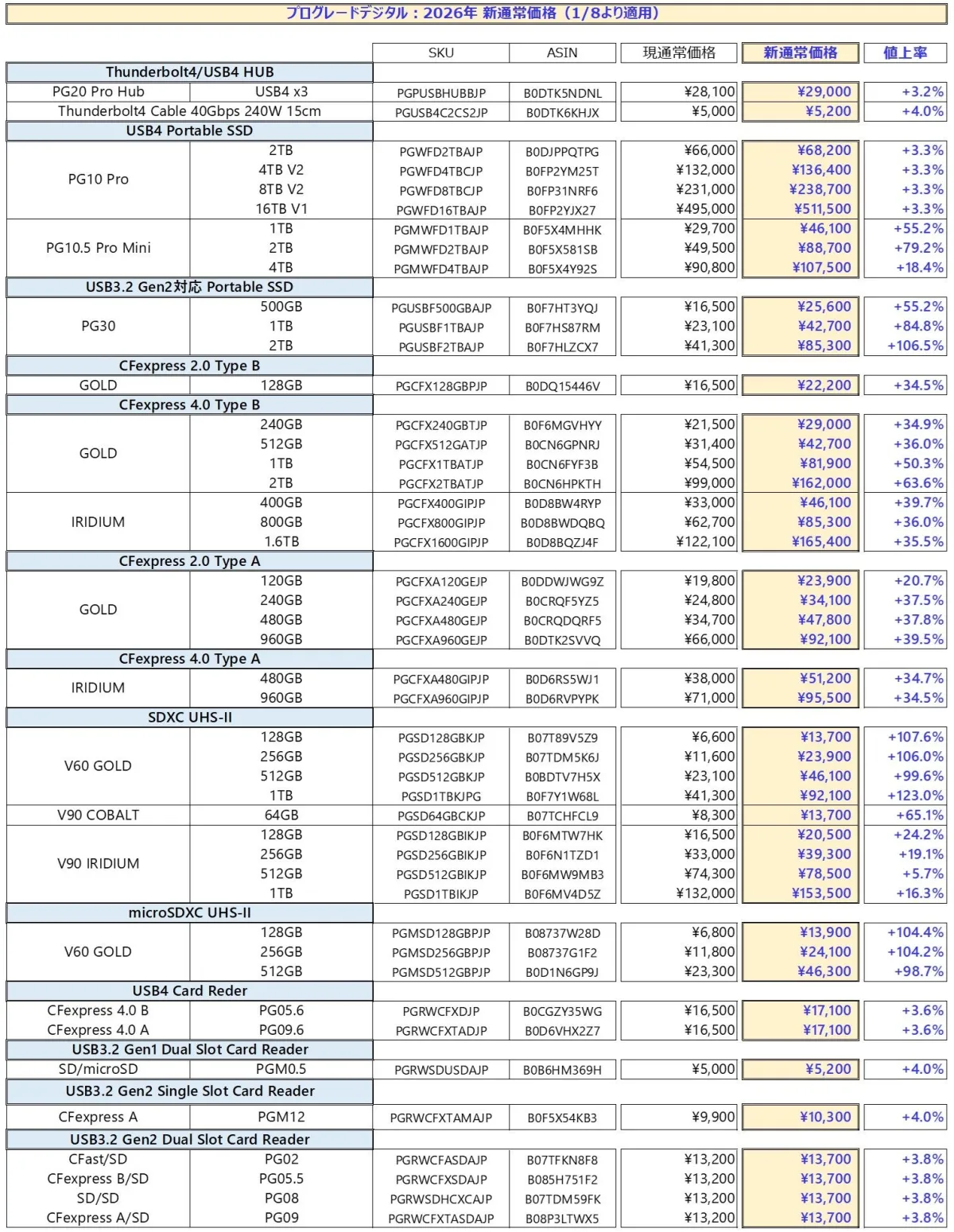 ProGrade Digital Inc.は、2026年1月8日より通常価格の値上げを行うことを発表しました。これは主に、AIインフラの構築に伴い急増する半導体メモリーの需要によるものです。特に、フラッシュメモリーの価格は大幅に上昇しています。