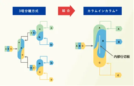 『カラムインカラム®』の革新性はその構造にあります。従来の蒸留プロセスでは複数の塔を使用し、それぞれで熱の入れ替えが行われるため、多くのエネルギーを消費します。このシステムは、蒸留塔内部に設置した仕切り板により、複数の機能を1つの塔に統合。これによりユーティリティの使用量を大幅に削減し、ランニングコストの圧縮にも貢献します。