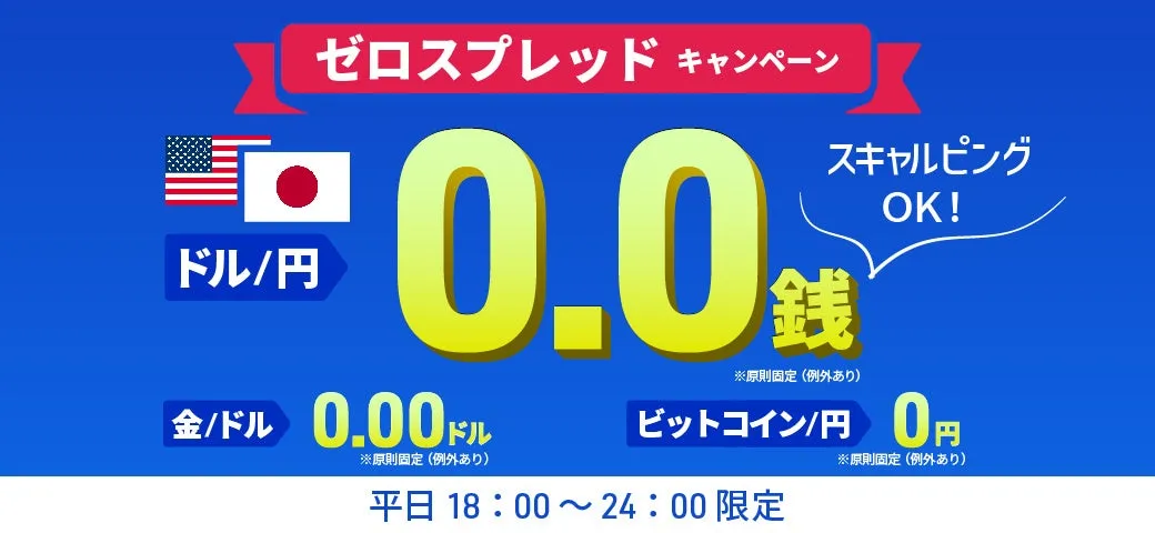 ゴールデンウェイ・ジャパンが新たな取引環境を提供するために、ゼロスプレッドキャンペーンを発表しました。このキャンペーンでは、特定の時間帯において、ドル円(USD/JPY)、金ドル(XAU/USD)、ビットコイン円(BTC/JPY)が対象となり、スプレッドが「0」に引き下げられます。特別な申し込みは不要で、簡単に取引を開始することができます。