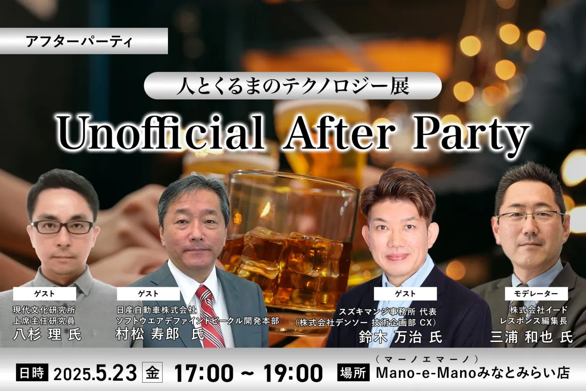 自動車業界の関係者同士、そして情報交換を深める絶好の機会がやってきます。株式会社イードが主催する「人とくるまのテクノロジー展 Unofficial After Party」が2025年5月23日(金)に開催されます。このビジネスイベントの目的は、展示会で得た最新の技術トレンドをじっくりと掘り下げ、業界のリーダーたちとカジュアルに交流することです。
