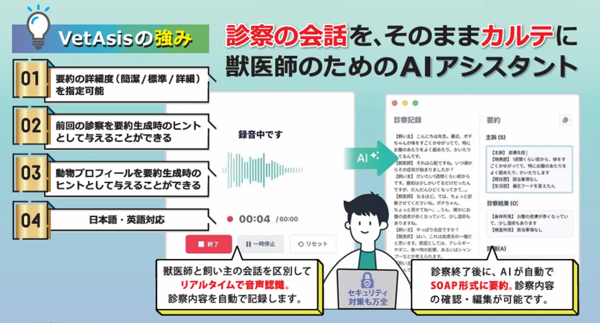 この共同プロジェクトの第一歩として、上大岡キルシェ動物医療センターにおいてVetAsisのトライアルが行われました。同院では、診療中の獣医師と飼い主のやり取りがAIによって記録され、それがSOAP形式で整理されることで、カルテ作成の効率化が実現されました。この実験により、現場での実用性も確保され、トライアルの結果は大きな成果として評価されています。
