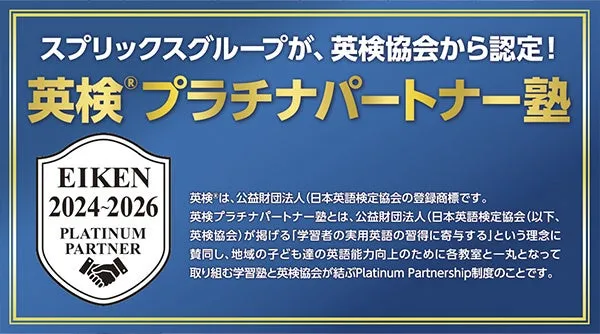 「英検プラチナパートナー」は、英語教育の品質を保証するもので、英検協会が定めた基準を満たす塾に与えられる称号です。スプリックスグループは、英検®に向けたサポートを充実させることで、今後ますます地域に根ざした英語教育を推進していく予定です。