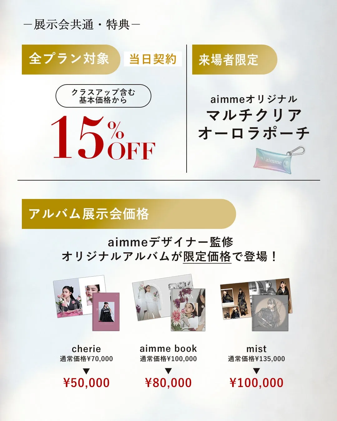 - - 展示会限定価格のアルバム:大切な思い出を形にできるアルバムも特別価格でご提供します。