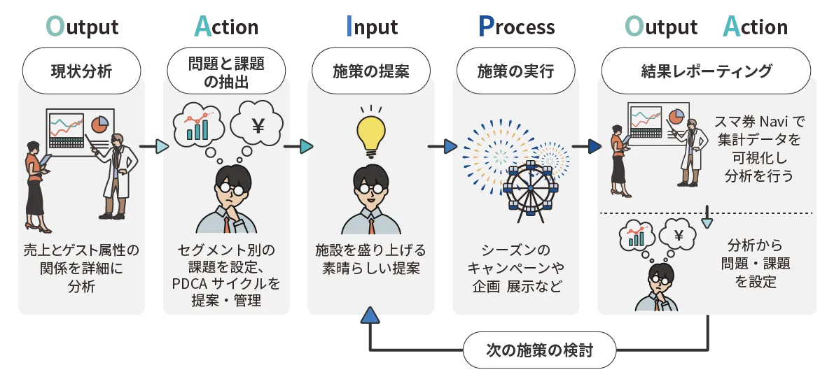 本サービスの導入は、まずゲストの行動分析から始まります。施設のホームページからチケット購入までのプロセスを分析し、ゲストが感じる不便さや使いにくさを特定します。その上で、具体的な改善策を提示し、効率的に集客を図ります。さらに、既存サービス「スマ券Navi」のデータを用いて、ゲスト属性に基づいた詳細な分析も行い、PDCAサイクルを回していきます。