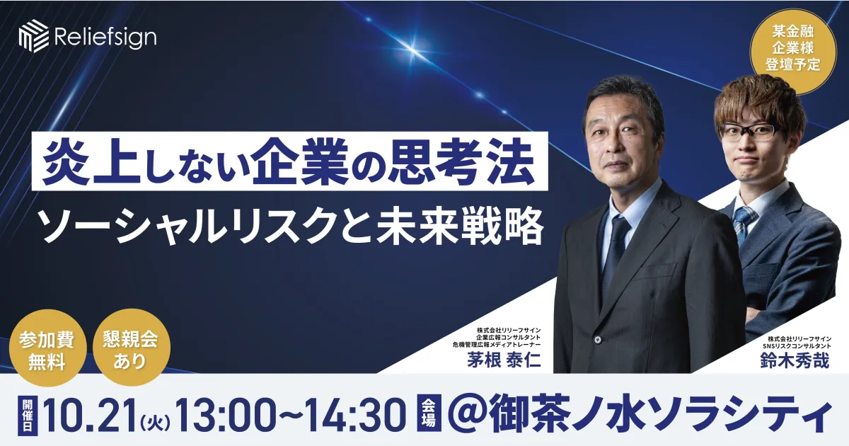 企業がSNSを活用する中、炎上や誹謗中傷といったリスクが深刻化しています。2025年10月21日(火)、株式会社リリーフサインが御茶ノ水ソラシティで開催するセミナー「炎上しない企業の思考法〜ソーシャルリスクと未来戦略〜」では、広報・危機管理担当者が知っておくべき対策を詳しく解説します。