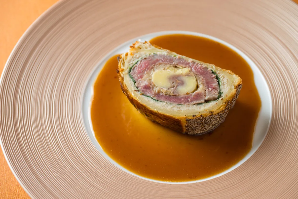 まずご紹介するのは、東京都渋谷にある「モノリス」で提供される「茨城県産食材フェア コース」です。こちらのコースでは、「常陸牛 煌」のサーロインを主役にしたパイ包み焼きが楽しめます。その肉厚でとろける食感は、一度食べたら忘れられない味わい。この料理では、茨城県産の栗やほうれん草、鶏肉、そしてキノコが絶妙に組み合わさった具材が香ばしいパイ生地に包まれ、さらにラム酒を加えたソースが全体を引き立てています。