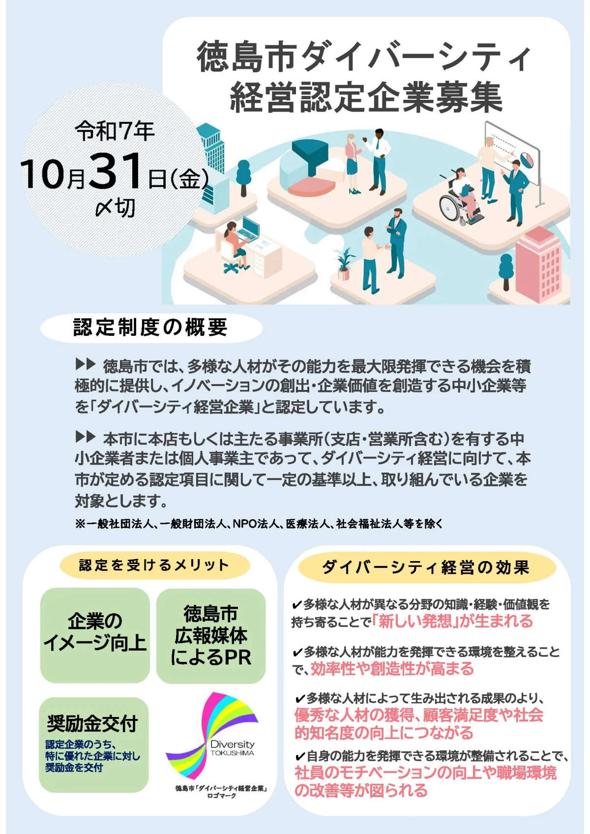 令和7年度の募集は、2023年10月31日までの期間内に行われます。対象となるのは、徳島市に本店や主たる事業所を有する中小企業者、または同市に住民票を有し、実際に事業を営む個人事業主です。また、指定された「ダイバーシティ経営」の認定項目について、一定の基準以上の取り組みを行っていることが求められます。