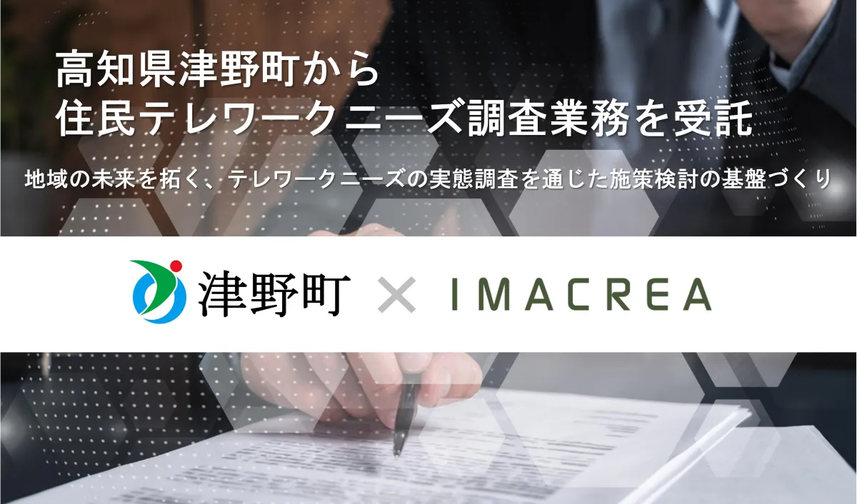 この調査では、対象となる住民に対し、テレワークに必要な情報やサポートがどれほど求められているかを探ります。また、住民からの回答を得る際には、イマクリエがこれまで展開してきた全国の自治体との連携による「テレワークセミナー」のダイジェスト版を作成し、その映像を視聴してもらいます。この受講後、住民のテレワークに対する関心の変化や、自治体が提供すべき支援内容を視覚化し、津野町の今後の施策検討にもつなげていく予定です。