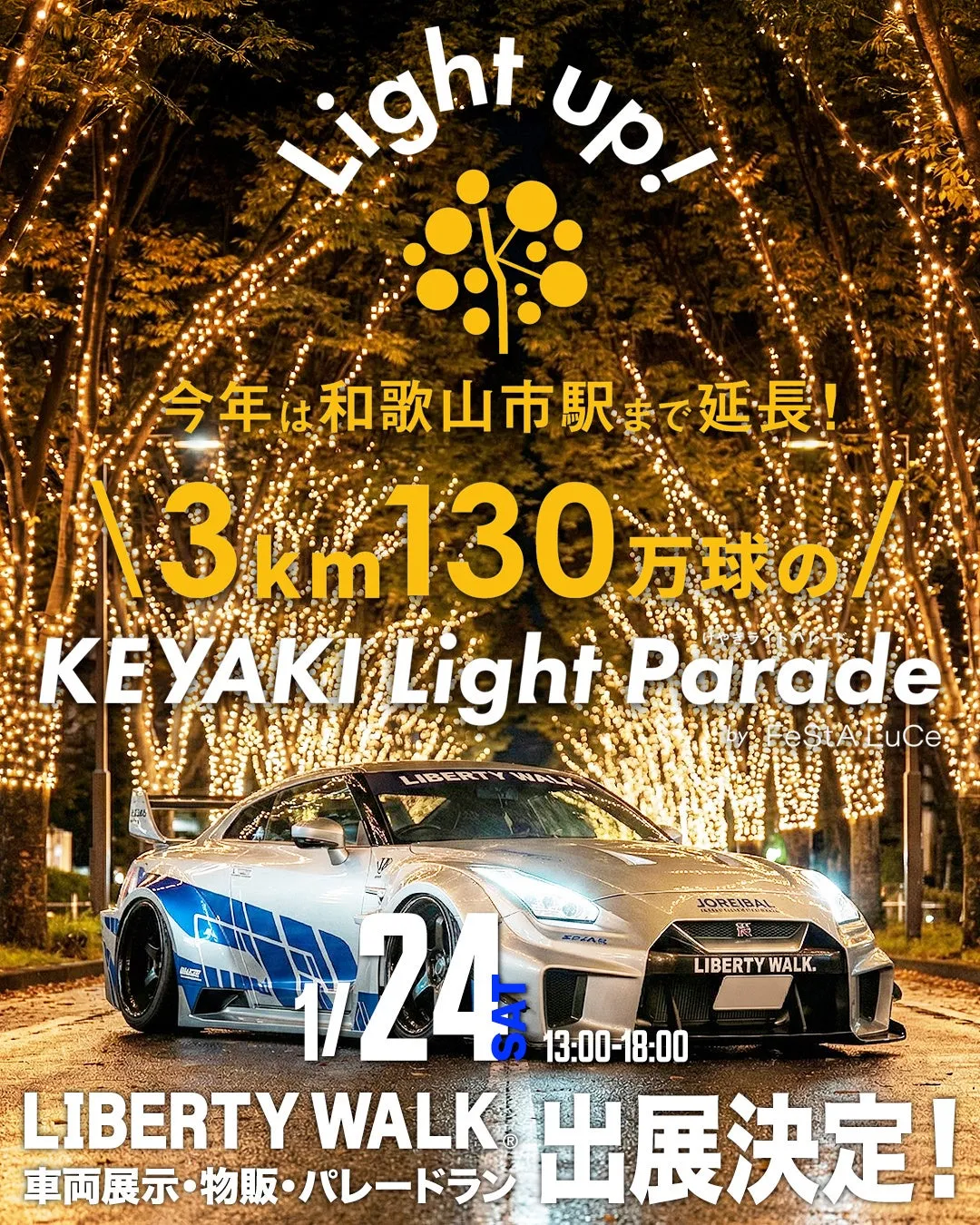 - - 内容: 世界的に有名なカスタムブランド「LIBERTY WALK」が手掛ける約30台のスーパーカーを展示事前に見ることができます。パレードは、南海和歌山市駅からJR和歌山駅までの2周となっており、多くの観客で賑わいます。