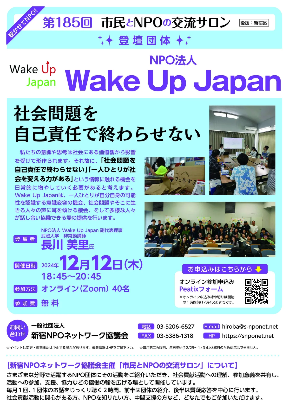 2024年12月12日(木)に新宿で開催される第185回市民とNPOの交流サロンでは、認定NPO法人Wake Up Japanが登壇します。このイベントは、市民とNPOの間に架け橋を作り、社会貢献活動への理解と参加を促進するための絶好の機会です。