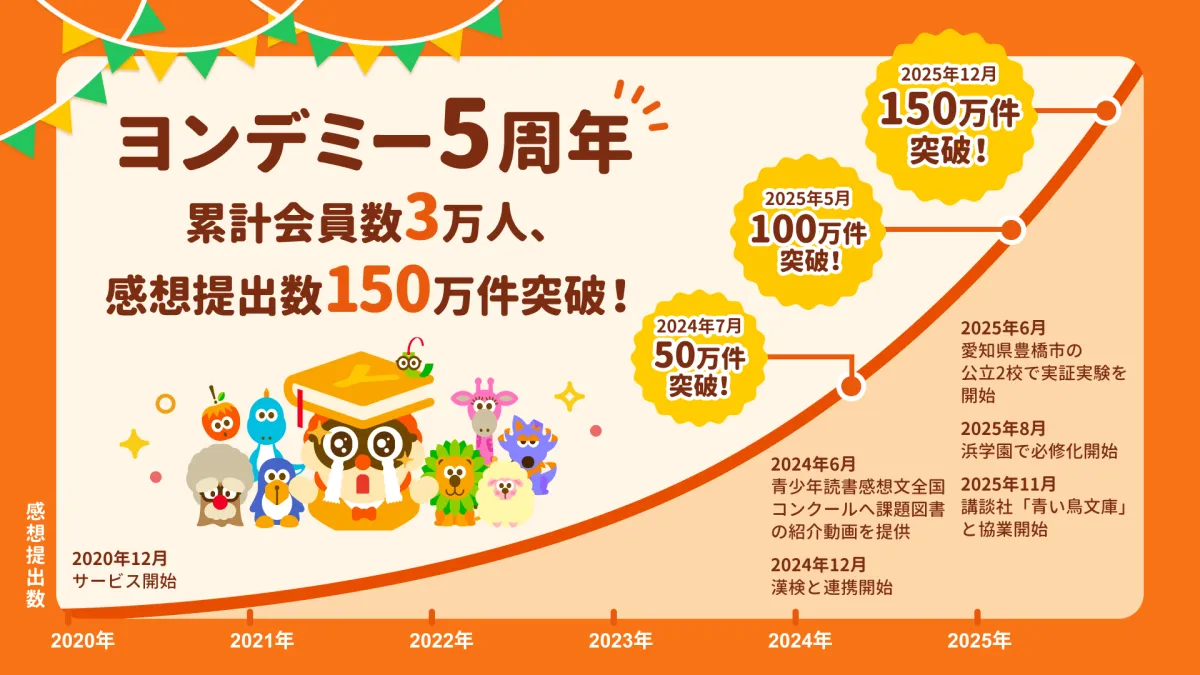 子どもたちの読書習慣を楽しく支援するオンライン習い事「ヨンデミー」が、2025年12月にサービス開始から5周年を迎えました。この5年間で、教育の現場に新たな風を吹き込むとともに、読書を通じた子どもたちの成長を見守ってきた成果として、累計受講者数は3万人、そして150万件を超える読書感想が寄せられたことを発表しました。