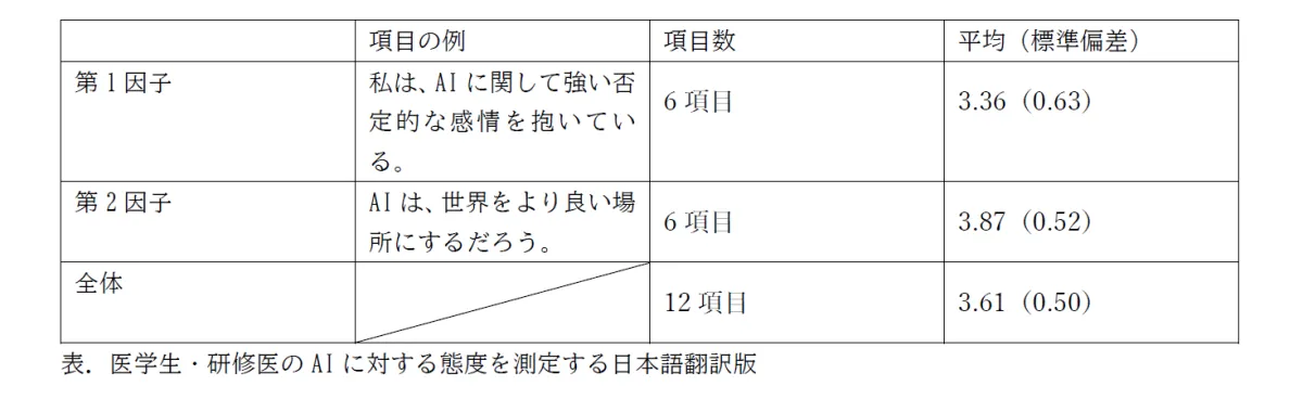 研究では、海外で開発された「12-item Attitudes Towards Artificial Intelligence scale (ATTARI-12)」を日本語に翻訳し、その後、全国の大学および病院を対象としたオンライン調査を実施しました。この調査には326名が参加し、因子分析を行った結果、尺度が2因子から構成され、高い構造的妥当性が確認されました。さらに、クロンバックアルファ係数が0.84という良好な値を示し、内的一貫性も確認されました。