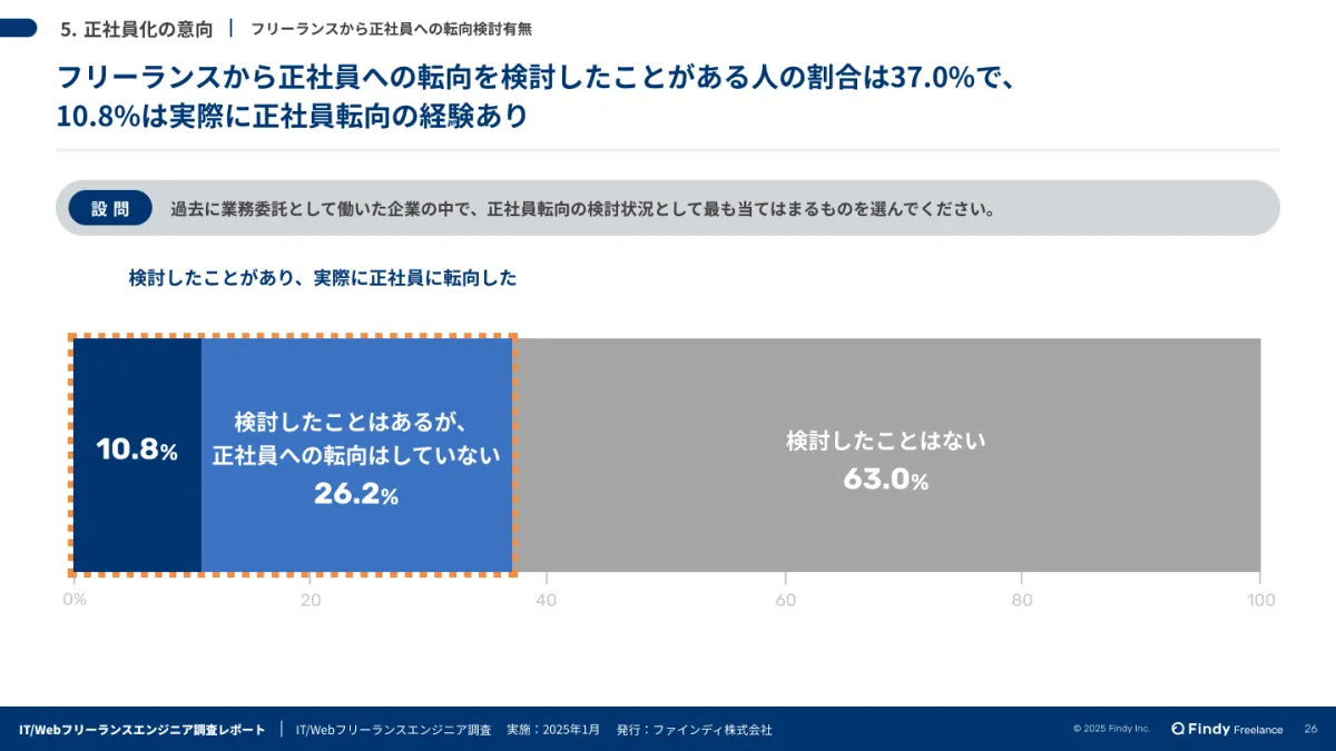 調査を行ったファインディ株式会社によると、フリーランスから正社員に転向を検討したことがあるエンジニアは37.0%に達し、そのうちの10.8%が実際に正社員としての職を経験しています。この振れ幅は、フリーランスという働き方の自由さと正社員の安定性を天秤にかけている結果とも言えるでしょう。