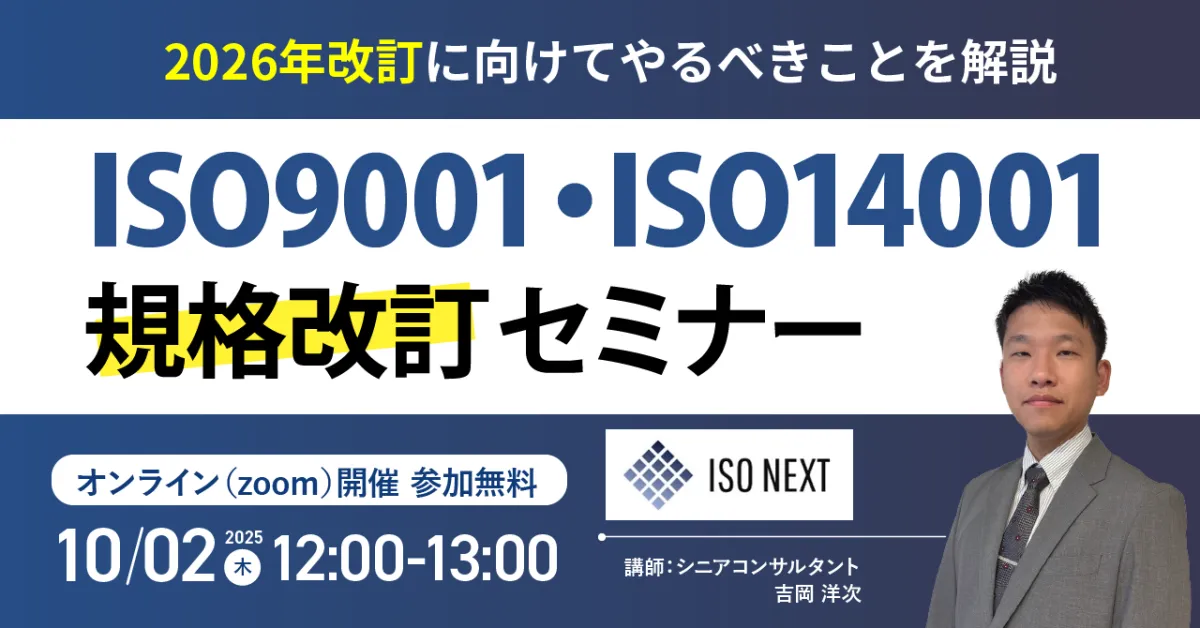 2026年9月頃にISO9001とISO14001の規格が改訂予定です。これにより、多くの企業は新しい基準に従った事業活動の見直しを求められることになります。特に、大手企業においてはサプライチェーン全体を考慮した運用体制の整備が必要です。このため、時間が限られている中での情報収集や対応策の検討は非常に重要ですが、容易ではありません。そこで、大手企業向けの特別企画として、本セミナーが企画されたのです。