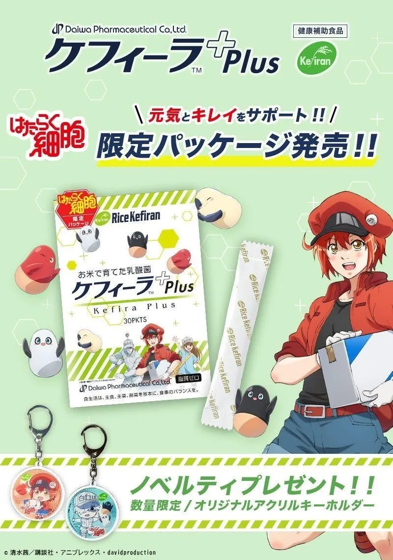 大和薬品株式会社が手掛ける健康補助食品「ケフィーラPlus」が、TVアニメ『はたらく細胞』とのコラボレーションパッケージで登場しました。健康をサポートするために開発されたこの商品には、アニメのキャラクターたちがパッケージデザインを飾っており、ファンにはたまらない魅力が詰まっています。