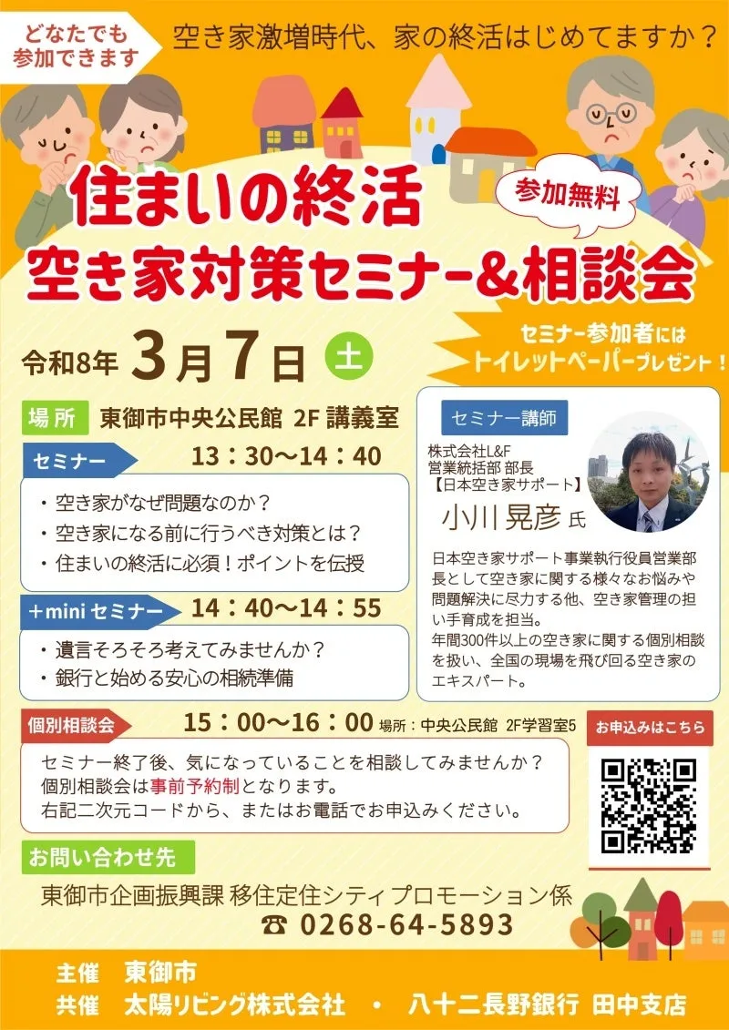 セミナーは、2024年3月7日(土)午後1時30分から午後4時まで、東御市中央公民館で行われます。参加者は、空き家を所有している方や将来的に空き家になる可能性がある人のみならず、空き家問題に関心を持つ市民の方々まで広く対象としています。参加は無料で、特に事前に申し込みが必要です。