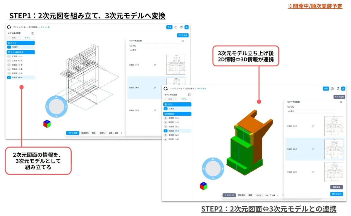 - - 2D⇔3Dの相互連携機能:2次元図面と3次元モデルの整合性を確保するための連携機能が計画されており、この技術により各図面の整合性が保たれます。
