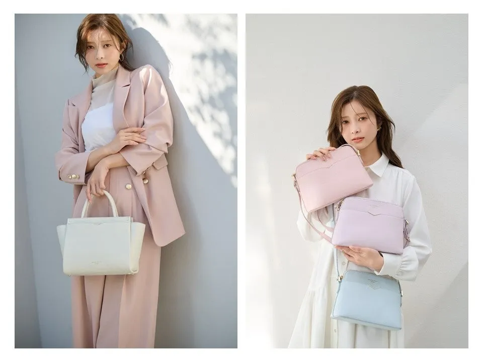松川星さんが持つのは、春らしさを感じさせるパステルカラーのショルダーバッグ。優しい色合いが柔らかい雰囲気を醸し出し、華やかさと華奢さを兼ね備えています。さらに、ゴールドの金具がアクセントとなり、一段と煌びやかさを引き立てています。