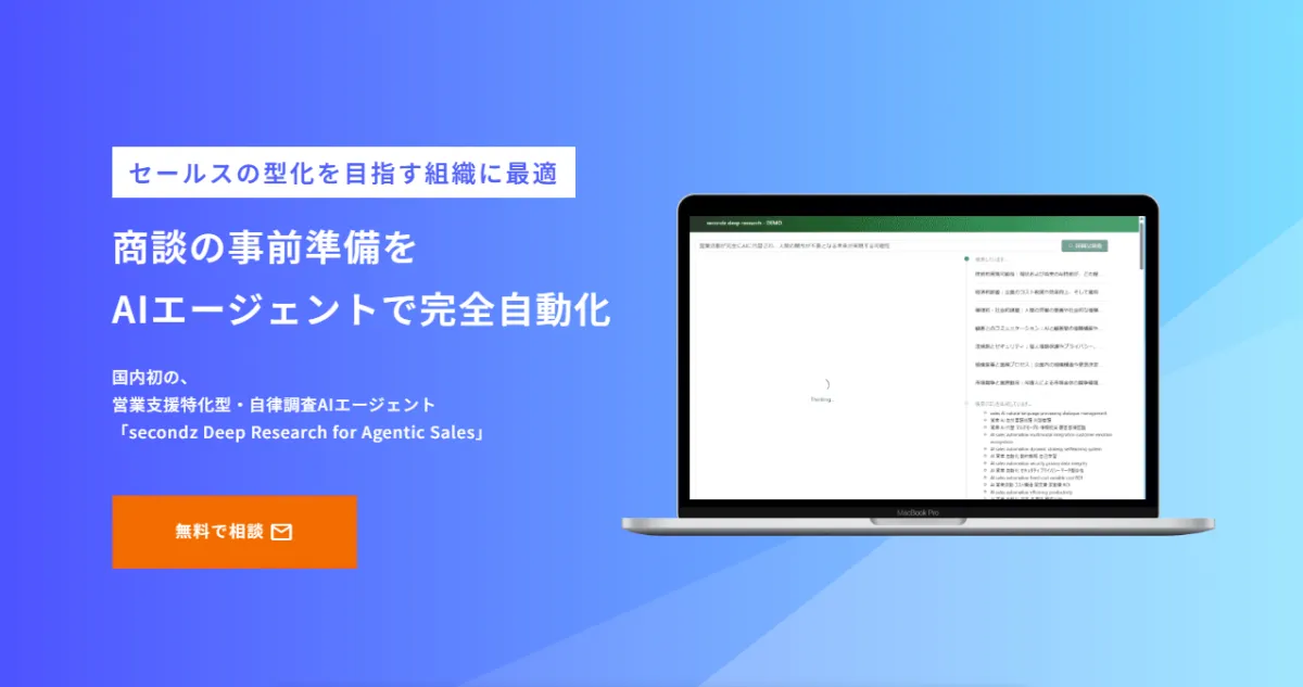 「secondz Deep Research」は、最新の推論モデルとマルチエージェント技術を駆使し、公開情報からリサーチ計画を自動的に作成し、数段階の調査を人手を最小限に抑えて完了させることを目的としています。これにより、企業は膨大な調査工数を削減し、効率的な営業活動を実現します。特に「for Agentic Sales」では、顧客の理解を深めるための機能が強化されており、商談準備や提案資料の作成において、時間と労力を大幅に削減することが可能です。さらに、企業ごとに専任のコンサルタントが配置され、自社の商材に特化したAIの学習や最適運用が支援されます。